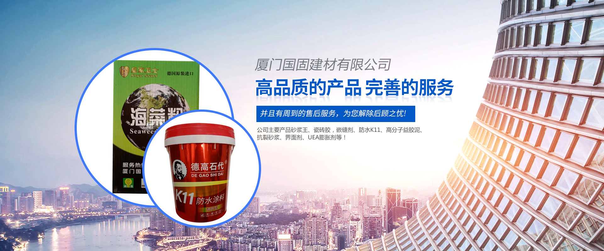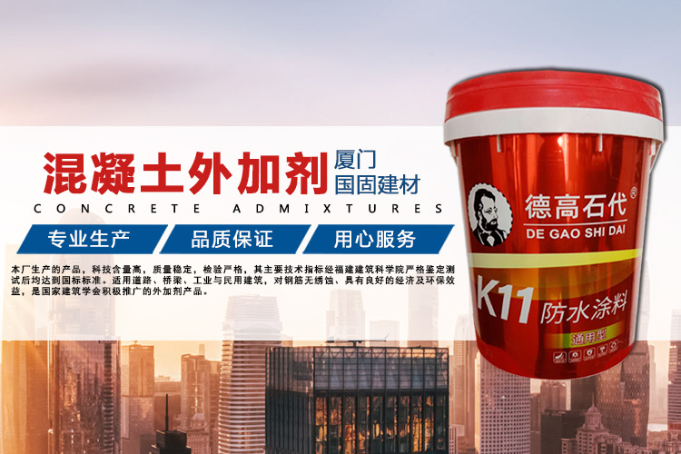 ??廈門國固建材有限公司是集科研開發,生產為一體的混凝土外加劑科技生產單位,公司技術力量雄厚,工藝科學先進,產品質量及性能在全國同行業中。并且有周到的售后服務,為您解除后顧之憂。本廠生產的產品,科技含量高,質量穩定,檢驗嚴格,其主要技術指標經福建建筑科學院嚴格鑒定測試后均達到國標標準。是目前水泥制品中理想的名加劑產品,適用道路、橋梁、工業與民用建筑,對鋼筋無繡蝕、具有良好的經濟及環保效益,是國家建筑學會積極推廣的外加劑產品。本廠推廣標準化,規范化、程序化管理、具有健全、完善、持續穩定運行的質量保證體系。產品遠銷上海、江蘇、浙江、廣州、北京、江西、安徽、福建等地,在大批國家建設工程中應用效果良好,并以性能優越、質量可靠、以及良好的售后服務在市場上享有很高的信譽。本廠在今后的歷程中,將一如既往的為您提供高質量、高科技的產品,完善的服務以感謝廣大客戶的支持和厚愛。“科技創新、以誠為本,用戶滿意”是我公司發展的永恒目標,我們堅持“以誠結情、質量取勝”,以高品質的產品回報社會。“用科興建材,創優品工程”,期待與各界朋友與時俱進,努力開拓進取,力求為用戶提供“高品質的產品,完善的服務”。公司愿與設計部門、建設單位、施工企業及同行們攜手合作,共創未來,共鑄輝煌、公司主要產品砂漿王、瓷磚膠,嵌縫劑、防水K11、高分子益膠泥、抗裂砂漿、界面劑、UEA膨脹劑等!